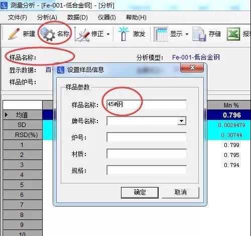 單擊“名稱”—“設(shè)置樣品信息”—“輸入樣品名稱(例如45#鋼)”—“確定”—“存儲(chǔ)”